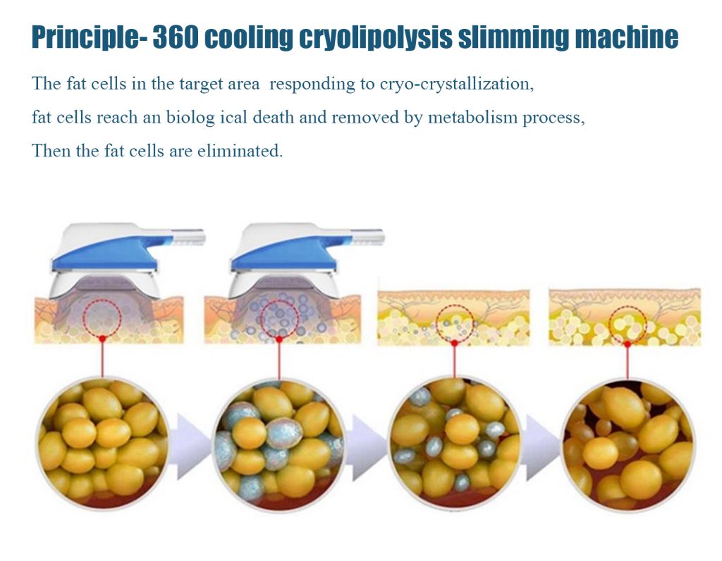 عملکرد کرایولیپولیز به این صورت است که ابتدا سلول های چربی شناسایی می شوند تا دما مورد نظر برای انجامد آن تعیین شود. در مرحله بعد با انتقال انرژی زیاد به سلول های چربی باعث تجزیه آن می شود در صورتیکه به بافت اطراف آن آسیبی وارد نمی کند. پس از عملیات خنک کنندگی، سلول های چربی تحت آپوپتوز که وظیفه کنترل مرگ سلولی را برعهده دارد، قرار می گیرند. سپس دیواره سلولی چربی تجزیه شده و لیپیدها یا چربی ها از سلول جدا می شونددر نهایت این لیپیدهای آزاد شده توسط سیستم تخلیه لنفاوی از طریق بدن دفع می شوند. این فرایند کاملا تدریجی بوده و هیچ آسیبی به سیستم لنفاوی بدن وارد نیکند.